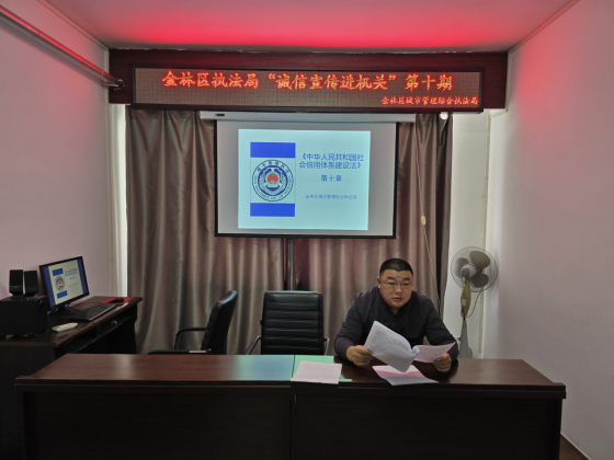 在单位LED屏播放诚信宣传标语、制作诚信宣传培训PPT,用投影讲解教学的方式,由金林区城市管理综合执法局局长秦巍向执法局全体干部职工讲解诚信宣传教育培训内容。