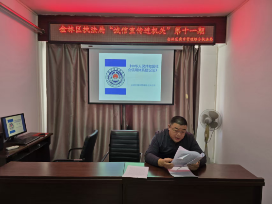 在单位LED屏播放诚信宣传标语、制作诚信宣传培训PPT,用投影讲解教学的方式,由金林区城市管理综合执法局局长秦巍向执法局全体干部职工讲解诚信宣传教育培训内容。