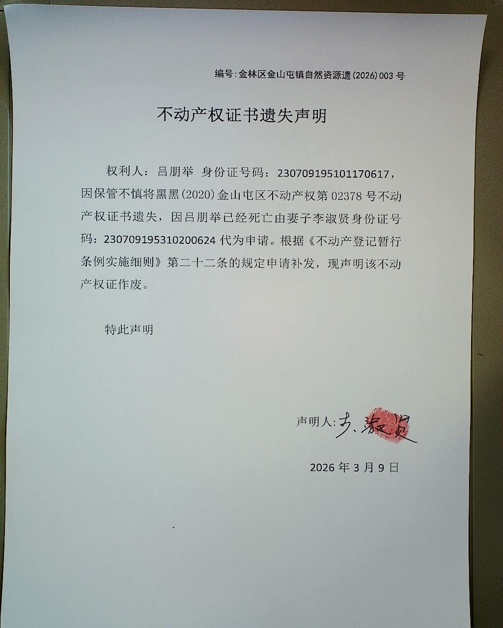不动产权证书遗失声明