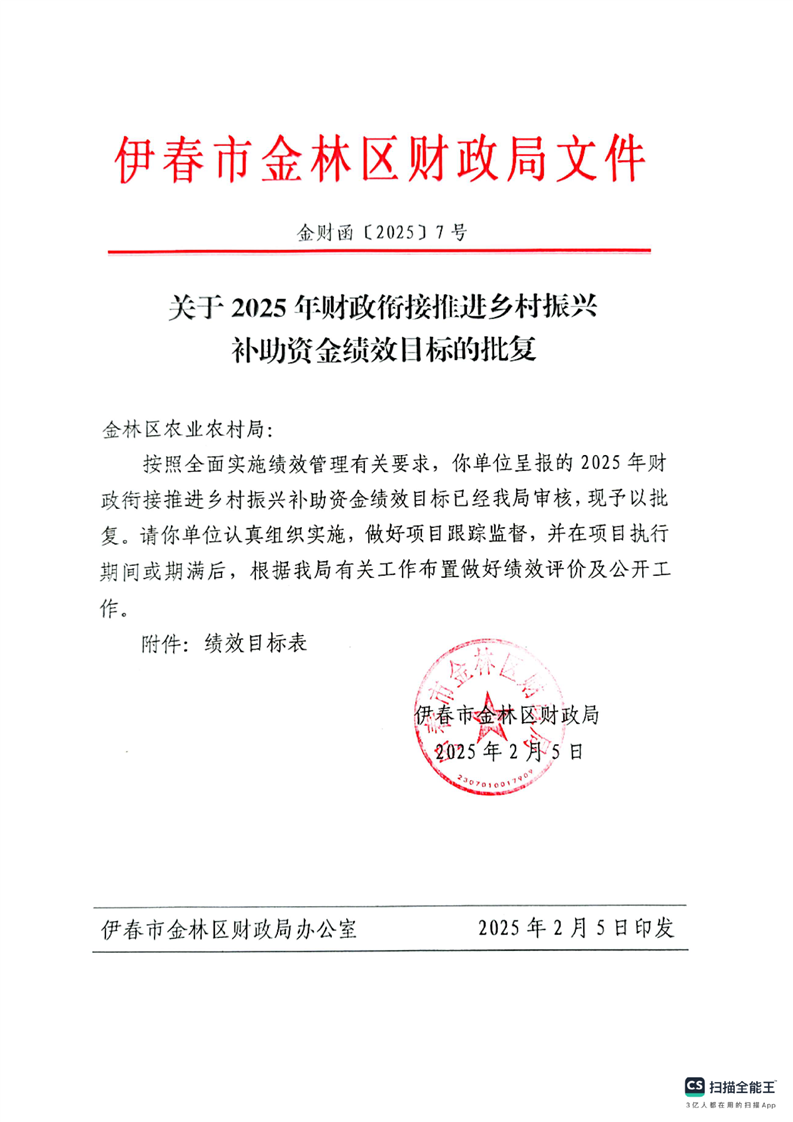 关于2025年财政衔接推进乡村振兴补助资金绩效目标的批复